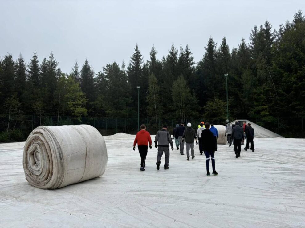 I když v sobotu počasí vůbec nepřálo a ke chladnému počasí se postupně během dne přidal i déšť, přesto se zhruba dvacítce statečných podařilo halu postavit. Tento týden ještě zbývá položit povrch a pak už první tréninky nadcházející zimní sezóny můžou začít Velké díky všem, kteří v sobotu dorazili a přiložili ruku k dílu
