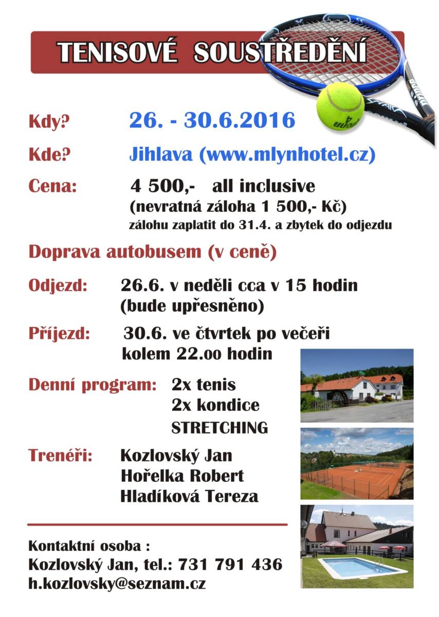 Stejně jako v loňském roce, tak i v tom letošním pojede v termínu 26. – 30.6.2016 TK Na Dolině na tenisové soustředění do Jihlavy. Toto soustředění je určeno především pro hráče našeho klubu, ale zúčastnit se ho mohou i hráči a hráčky z jiných tenisových oddílů. Pokud tedy máte zájem, neváhejte a kontaktujte Honzu Kozlovského na jeho…